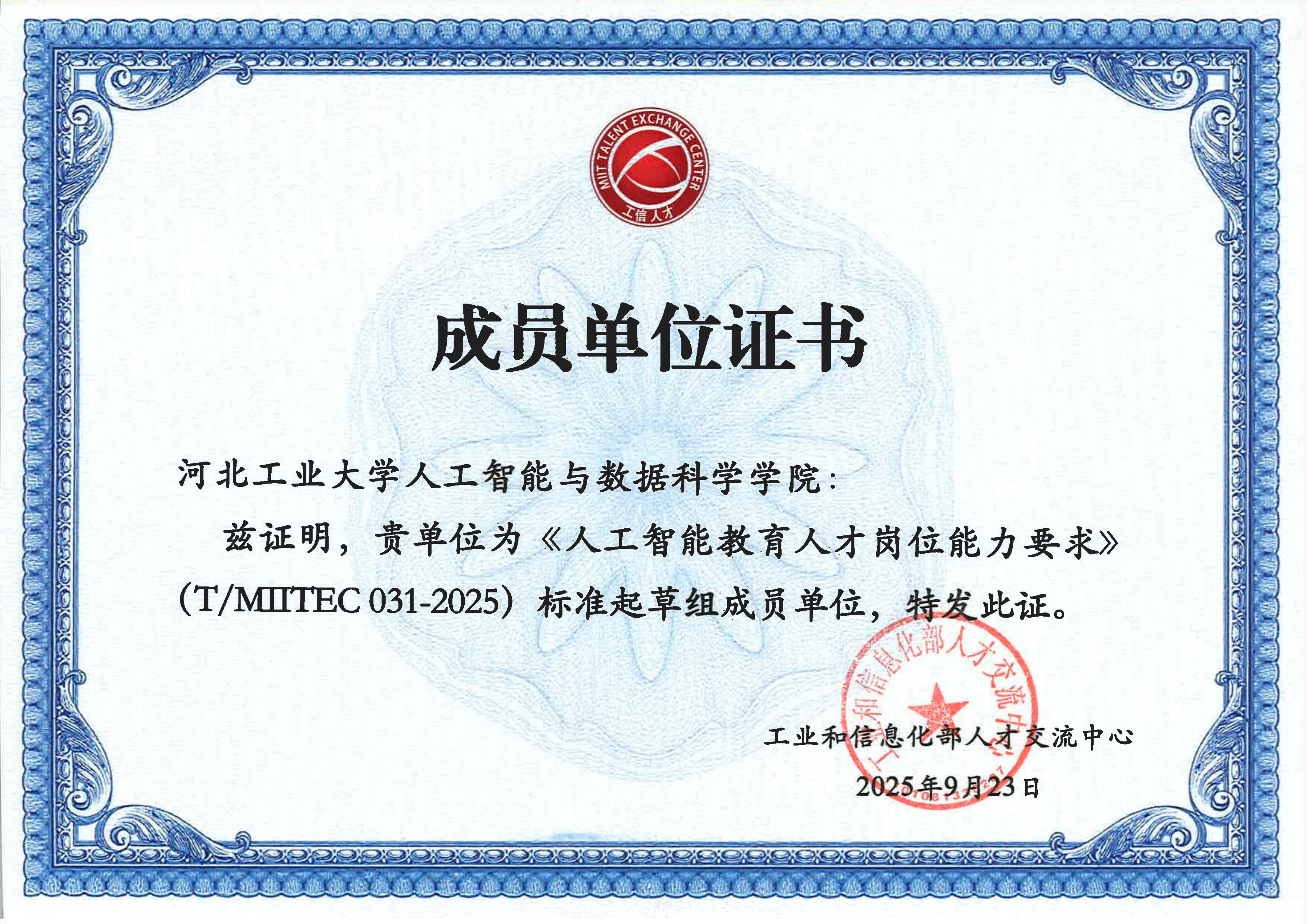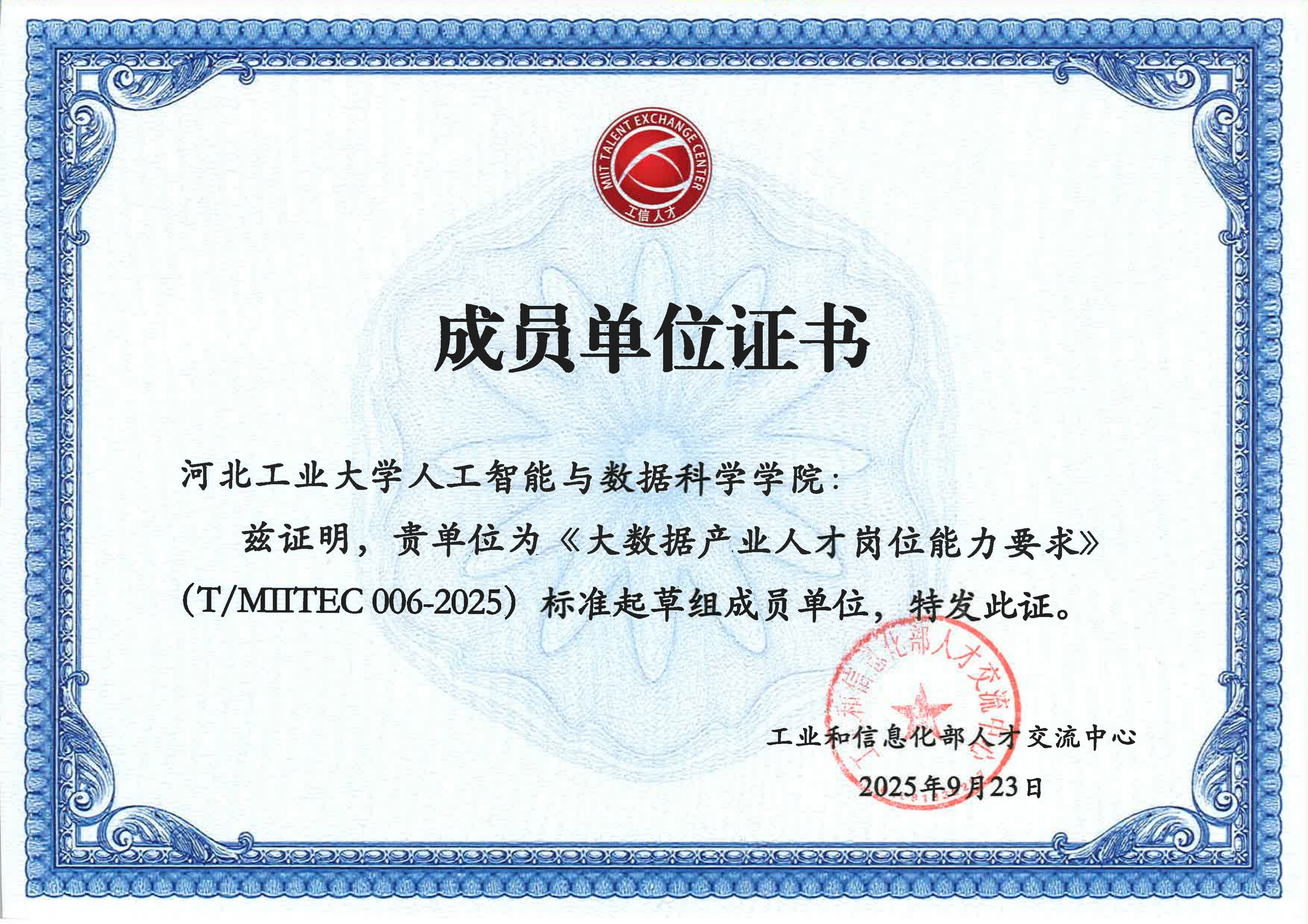 近日,河北工业大学人工智能与数据科学学院收到工业和信息化部人才交流中心颁发的两份证书,标志着学院成功入选《人工智能教育人才岗位能力要求》(T/MITEC031-2025)与《大数据产业人才岗位能力要求》(T/MITEC 06-2025)两项工信部人才标准的起草组成员单位。刘晶研究员团队深度参与了这两项标准的前期调研、框架设计及核心内容研讨,为标准的科学性与实用性构建提供了重要支持。