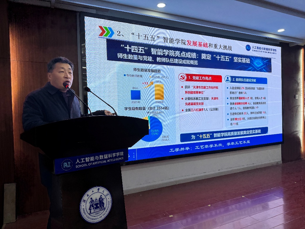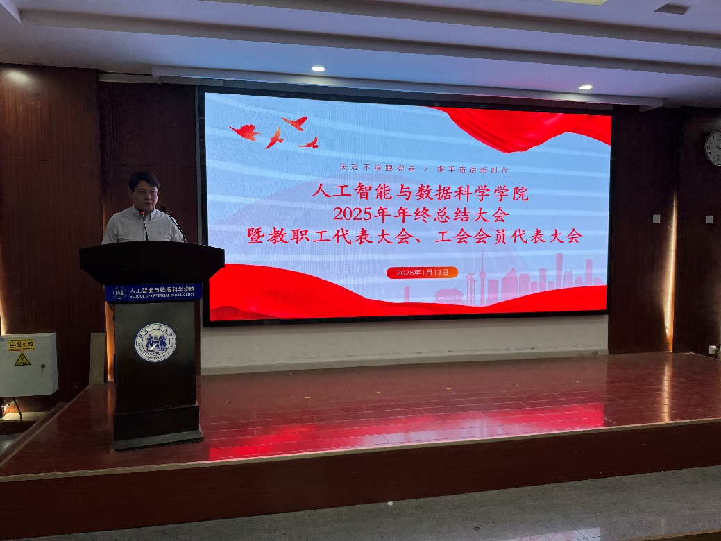 2026年1月13日下午,人工智能与数据科学学院在西教三112会议室召开2025年度教职工代表大会、工会会员代表大会(简称“双代会”)暨全院年终总结表彰大会。学院全体教职工参加会议,共同回顾总结年度工作成果,谋划未来发展蓝图。大会由学院副书记兼副院长兰天主持。